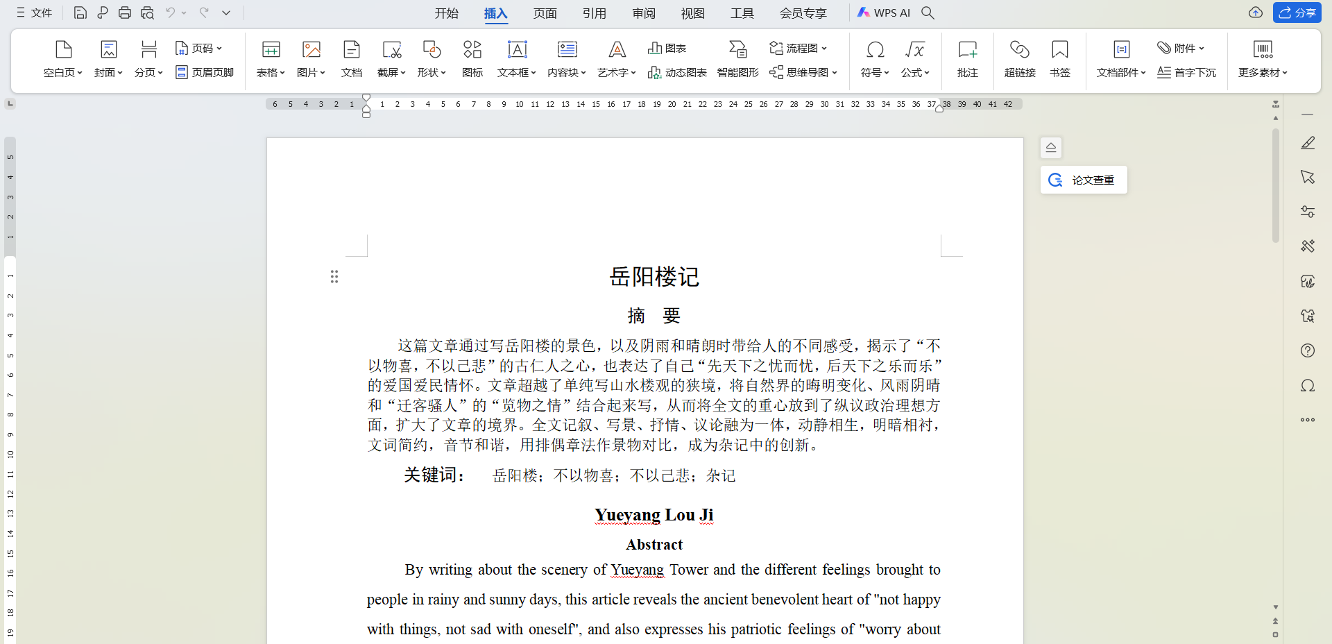 如果我们要将中文摘要和英文摘要分页,以此图为例,将光标放到“Yueyang Lou Ji”的左边,在上方菜单栏找到插入-分页-分页符,如下图所示。