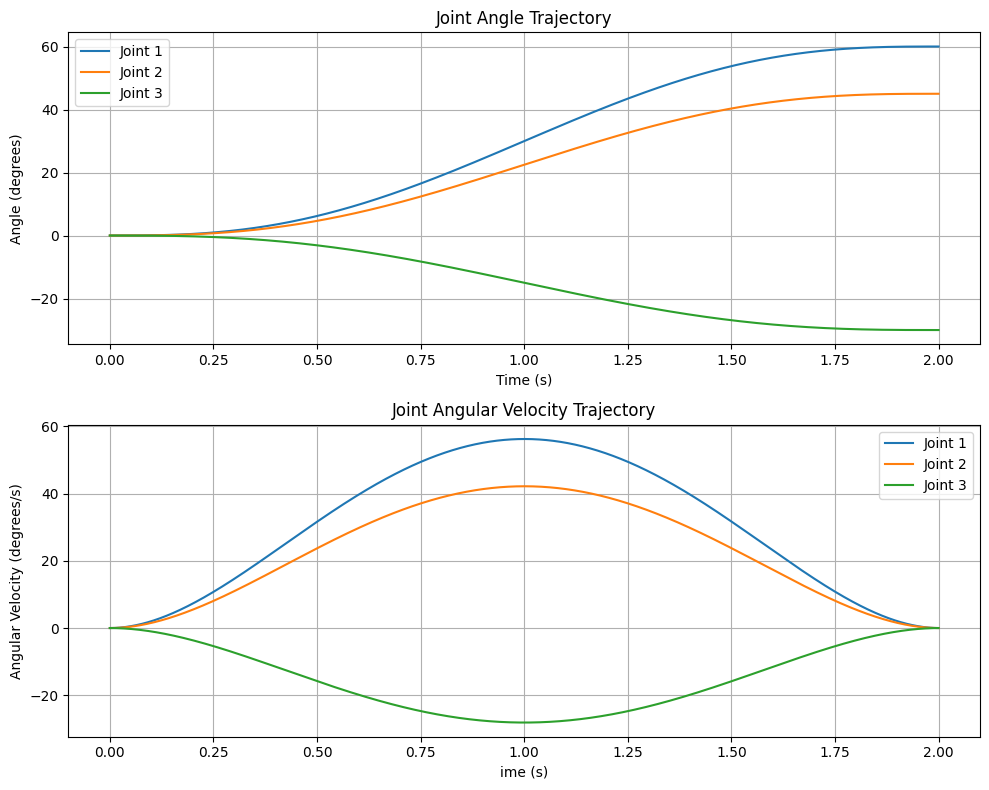trajectory, velocity = plan_joint_trajectory(start_pos, end_pos, duration=2.0)