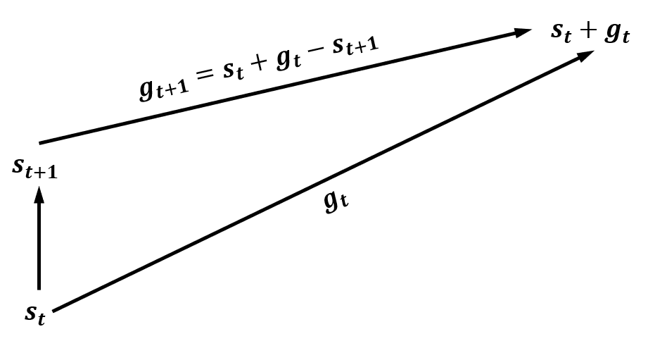 gt+1=h(st,gt,st+1)=st+gt−st+1 g_{t+1}=h(s_t,g_t,s_{t+1})=s_t+g_t-s_{t+1} gt+1=h(st,gt,st+1)=st+gt−st+1