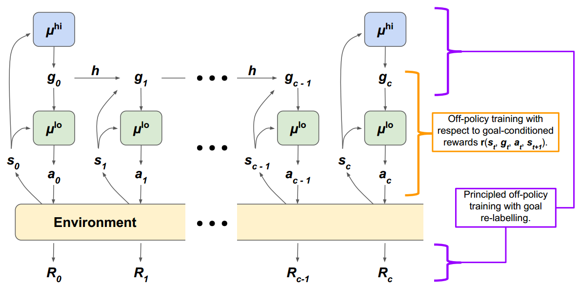 HIRO采用双层策略架构,由低层策略μlo\mu^{lo}μlo和高层策略μhi\mu^{hi}μhi组成。在每个时间步ttt: