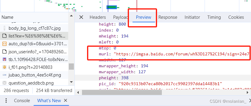 在preview里,可以找到图片地址murl。用正则表达式的方式来寻找图片地址。