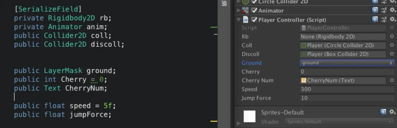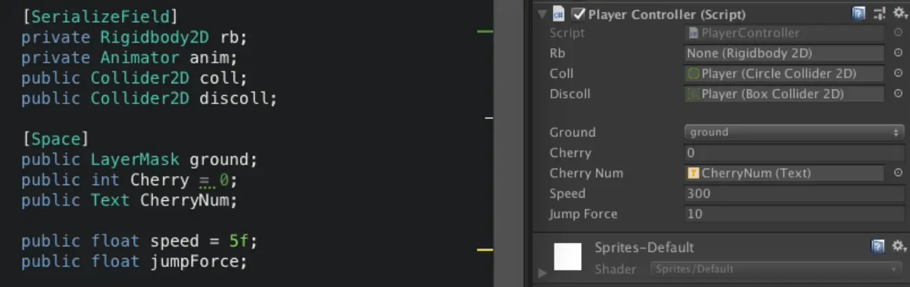 通常我们会在代码里用 Public 生成可见的变量;用 Private 生成不可见的变量。如果我想在测试阶段能够观察到 Private 的变量是否得到了我想要的值怎么办呢?可以参考下面的图片,在 Private 前面或者上面添加一个代码:[SerializeField]。