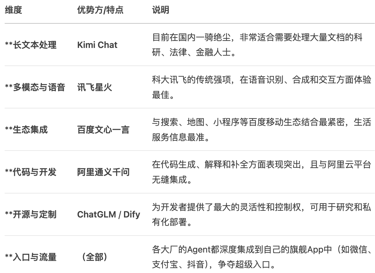 总结来说:** 对于普通用户,**Kimi**在信息处理上目前优势明显;对于开发者,**Dify**和**开源模型(如ChatGLM)** 是动手实践的最佳选择;而如果生活和工作深度绑定某个大厂生态(如百度或阿里),选择其对应的Agent可能会获得最无缝的体验。这个市场变化极快,今天的对比可能明天就会因为一次更新而改变。