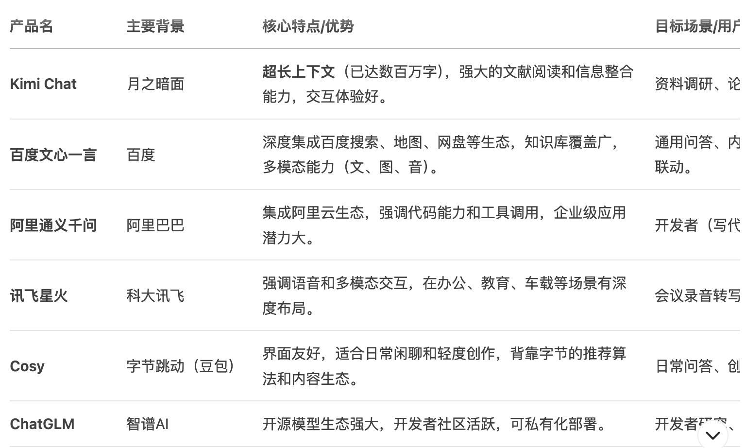 | **百度文心一言** | 百度 | 深度集成百度搜索、地图、网盘等生态,知识库覆盖广,多模态能力(文、图、音)。 | 通用问答、内容创作、本地生活服务查询、与百度系应用联动。 | 免费基础版,付费进阶版。 |