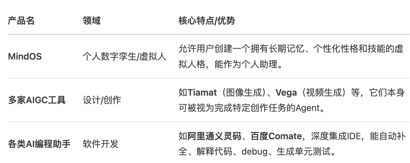 | **多家AIGC工具** | 设计/创作 | 如**Tiamat**(图像生成)、**Vega**(视频生成)等,它们本身可被视为完成特定创作任务的Agent。 |