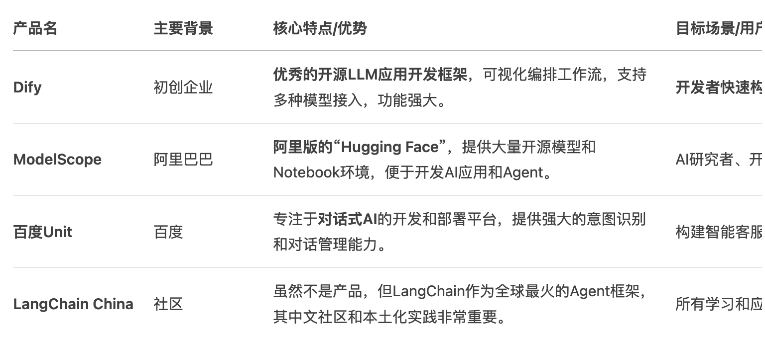 | **LangChain China** | 社区 | 虽然不是产品,但LangChain作为全球最火的Agent框架,其中文社区和本土化实践非常重要。 | 所有学习和应用LangChain框架的开发者。 |