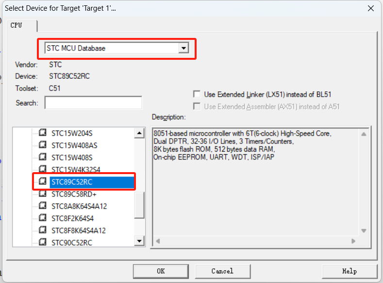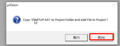 会弹出一个窗口,提醒选择开发板的型号,我是买的普中A2开发板,型号是STC89C52RC,选择CPU为STC MCU Database,再从下面STC选择STC89C52RC后点击OK,弹出一个对话框询问是否要复制启动 文件到工程文件下,如果选是会自动添加一启动文件,学习过程中不需要选择否即可: