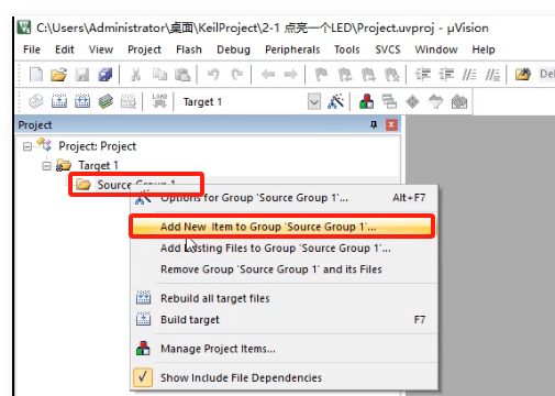 工程建好后,会在右面创建一个目录,点击最下方的Source Group 1,右键选择添加新的文件到这个组: