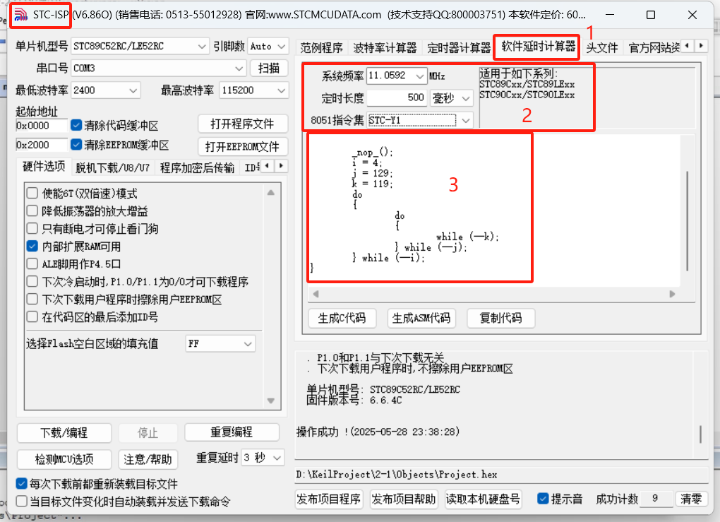 既然要实现亮灭循环,那么亮需要时间,灭也需要时间,我们需要再编制一下亮灭指令的延时,在STC-ISP的绿色软件里,有一个软件延时计算器工具选项(1),这里有延时代码,需要设置晶振频率、时间和8051指令(3):