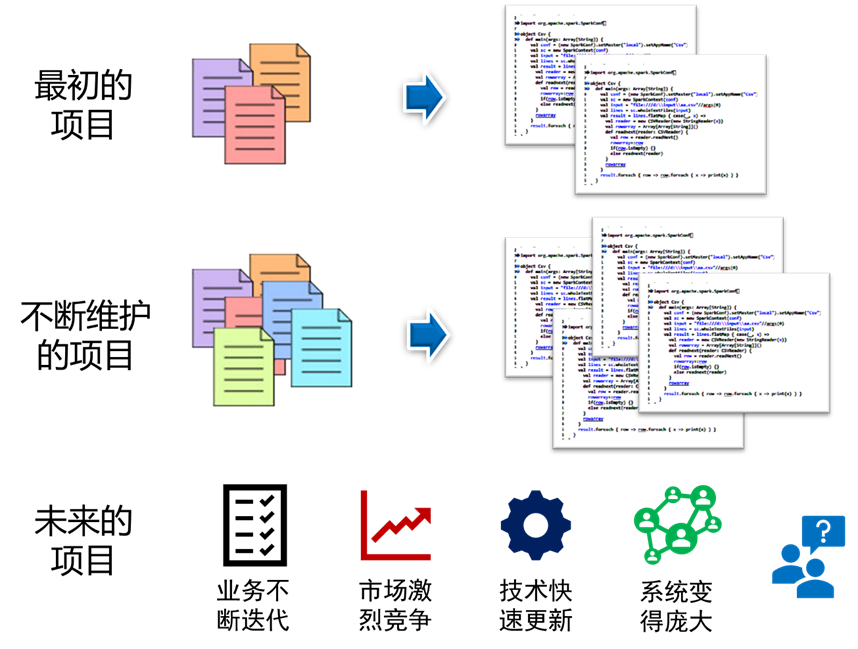 软件规模的复杂性就是说,刚开始的时候,客户只提出了比较简单的一些需求,我们对业务的理解也比较浅薄。但随着时间的推移,客户越来越深入地使用这个系统,就会提出越来越多、越来越复杂、越来越细致的需求。我们在不断变更维护去实现这些需求的过程中,就使得系统会做得越来越专业,让客户越来越满意。但与此同时,系统规模就会越来越大,业务逻辑越来越复杂,代码越来越多,不管是业务理解还是需求变更都会越来越困难,这就是“软件规模的复杂性”。