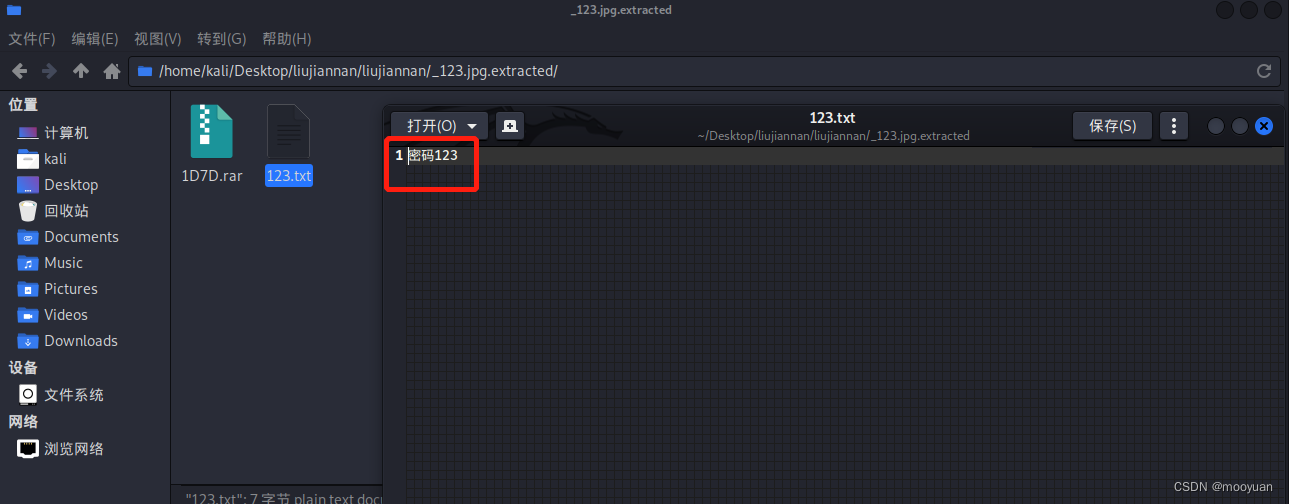 分离后效果如下所示,打开txt文件,如下所示文件内容为密码123,这基本上就是提示压缩包文件的密码为123。