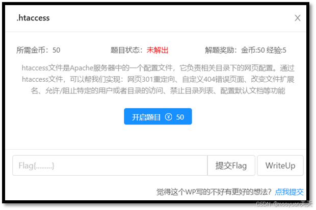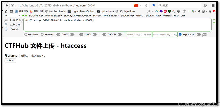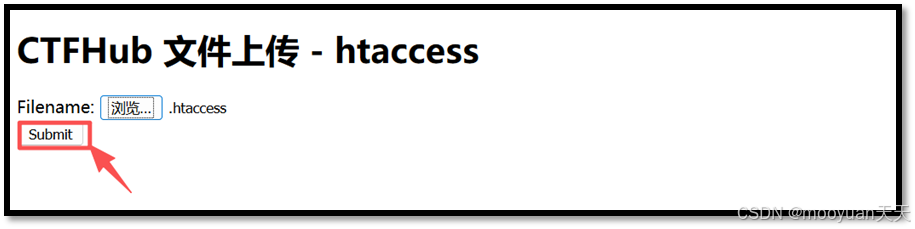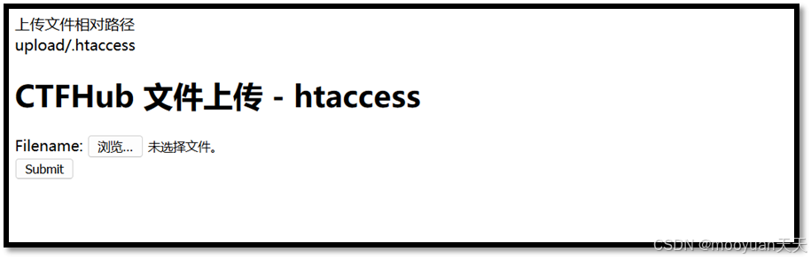 打开关卡如下所示,提示信息为“htaccess文件是Apache服务器中的一个配置文件,它负责相关目录下的网页配置。通过htaccess文件,可以帮我们实现:网页301重定向、自定义404错误页面、改变文件扩展名、允许/阻止特定的用户或者目录的访问、禁止目录列表、配置默认文档等功能”,提示本关卡可以利用htaccess进行文件上传绕过。