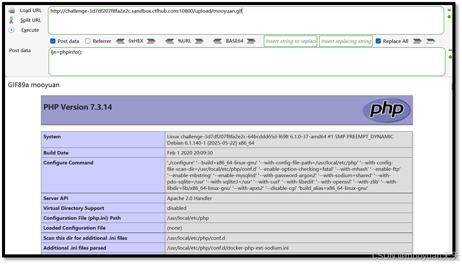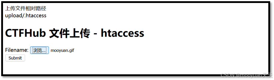 URL地址:http://challenge-3d7df207f8fa2e2c.sandbox.ctfhub.com:10800/upload/mooyuan.gif