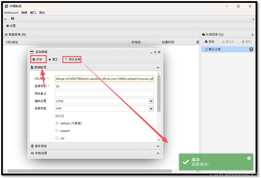 配置并连接蚁剑,具体步骤和URL脚本地址、密码、和连接效果如下所示。
