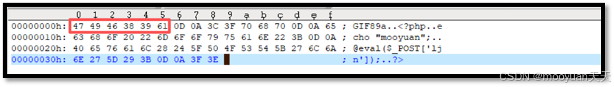 GIF(Graphics Interchange Format)文件常见版本有 GIF87a 和 GIF89a,它们的 16 进制文件头标识都是 47 49 46 38 39 61 ,对应 ASCII 字符就是 GIF89a 。右键16进制编辑,如下所示,mooyuan.php的文件头内容符合gif格式的文件头标识。