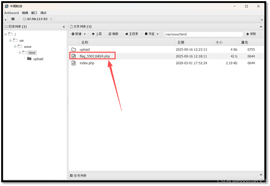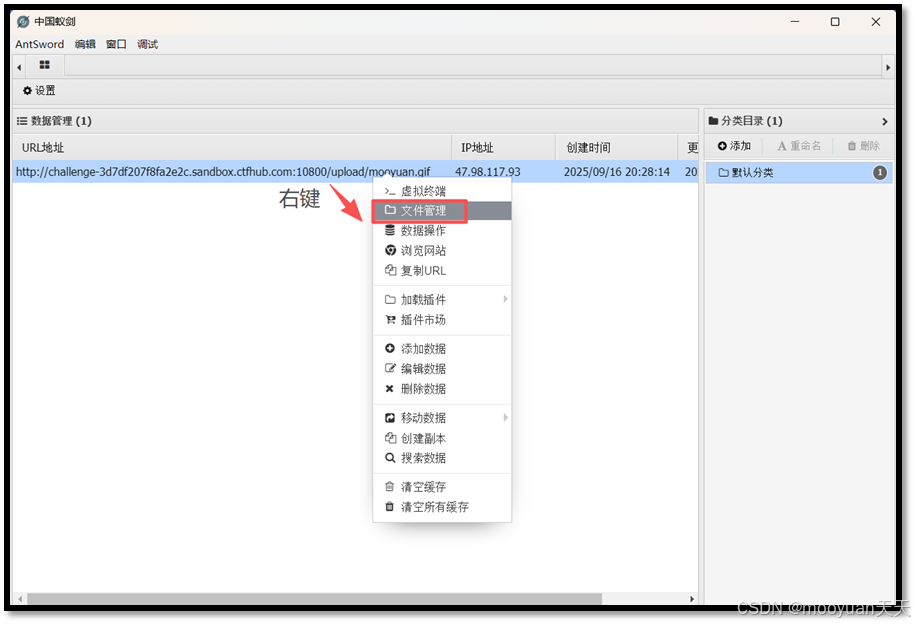在蚁剑中双击新添加的连接或追右键点击文件管理,进入靶场的文件系统中。F