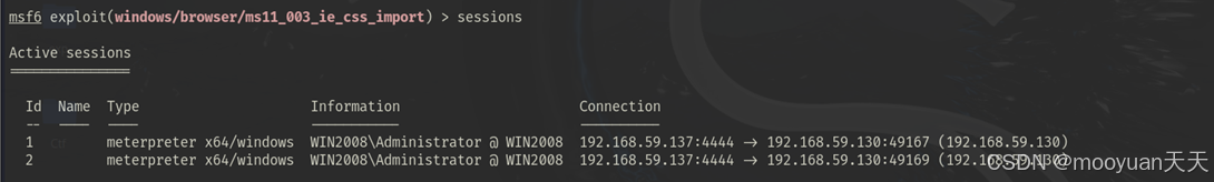 回到Metasploit命令行,使用 sessions 或 sessions -l 命令查看是否建立了新的会话,如下所示。