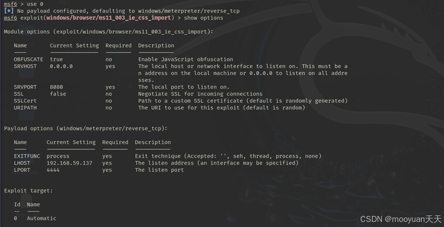 使用 use 0 命令选择了该模块。Metasploit 自动配置了默认的Payload(攻击载荷):windows/meterpreter/reverse_tcp。这是一个反向TCP连接的Meterpreter shell,成功后会回连到您的攻击机。