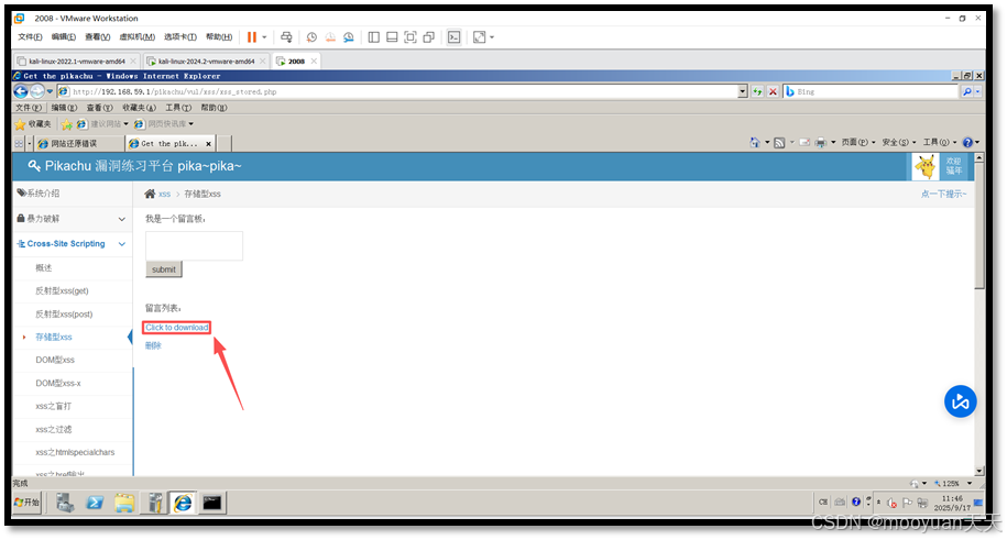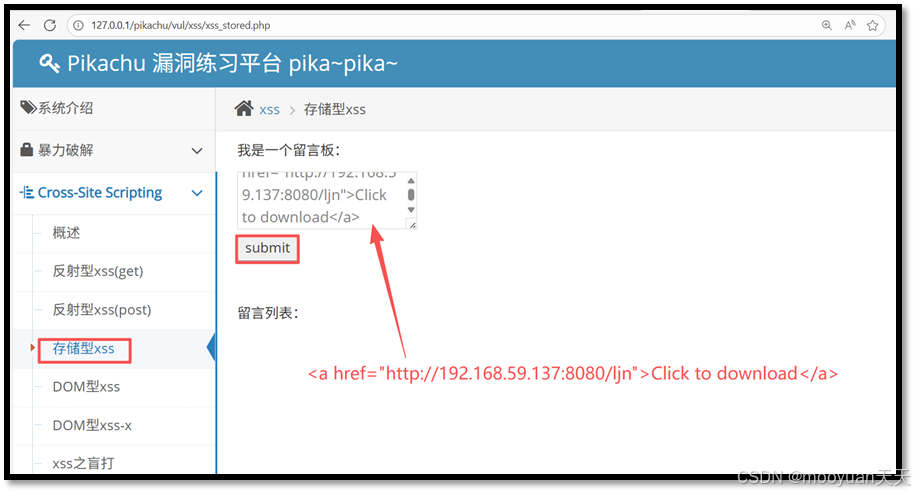 该XSS语句含义是创建了一个文本为“Click to download”(点击下载)的网页链接。指向地址:当用户点击这个链接时,他们的网页浏览器会尝试访问 http://192.168.59.137:8080/ljn 这个URL。