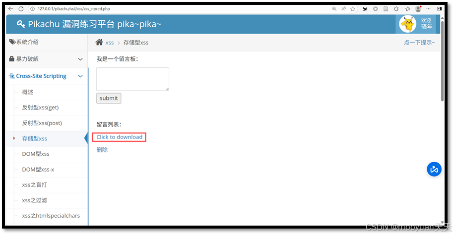1、访问pikachu靶场存储型XSS页面