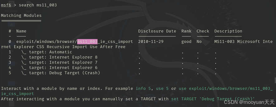 执行 search ms11-003 命令,Metasploit 返回了与之匹配的模块。结果显示只有一个 exploit 模块:exploit/windows/browser/ms11_003_ie_css_import。