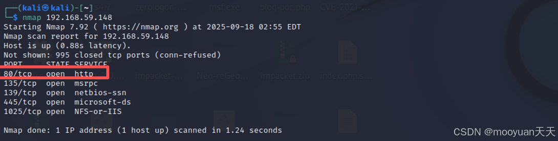 如下所示,使用nmap进行探测,端口80处于open状态,说明开启了web服务。