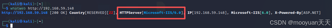 使用whatweb探测192.168.59.148的web服务,如下所示发现服务器为IIS6版本,可能存在CVE-2017-7269 WebDAV漏洞漏洞。