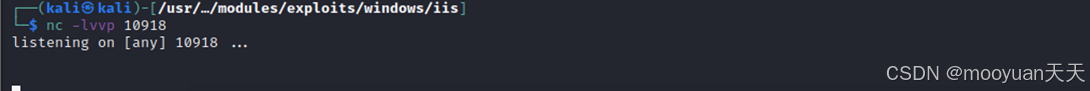 在本地主机的 10918端口启动一个 TCP 监听器,命令执行后,当前终端将处于挂起状态,持续等待传入的 TCP 连接。一旦有客户端(例如受控主机)成功连接,该监听器会立即建立一个原始的网络通信通道。此通道通常用于接收反向 Shell、实现文件传输或执行基础网络调试等操作。完整命令如下所示。