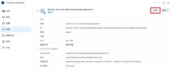 - 映像下载完成后,在 映像 页面选中 postgres (或你下载的版本),然后点击顶部的