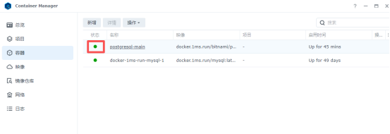 - 你应该能看到刚刚创建的 postgresql-main 容器,状态显示为 运行中。绿点为正确
