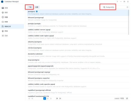 - 你会看到官方的 postgresSQL 映像排在第一个。双击它或者点击后选择“下载”。