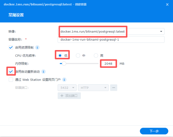 启用自动重新启动:强烈建议勾选此项。这样如果NAS重启或者容器意外关闭,它会自动重新启动。 - 点击 下一步。