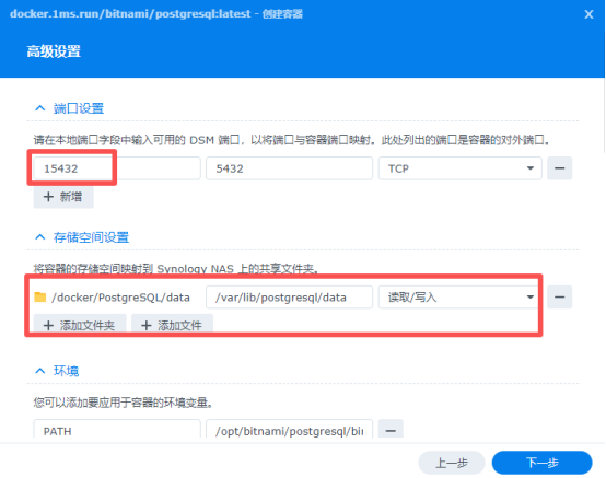 - 装载路径:这里必须填写 PostgreSQL 容器内部存放数据的标准路径,即 /var/lib/postgresql/data。请勿修改此路径!