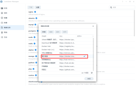 - 在 Container Manager 的左侧菜单中,点击 镜像仓库。 (默认加好仓库,不会看截图,国内的毫秒镜像速度还可以)