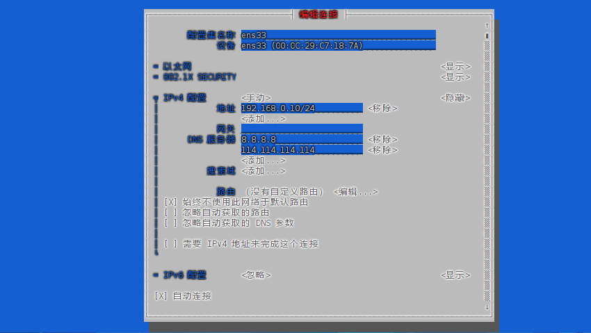 # 修改连接配置(以网卡 ens33 为例)
