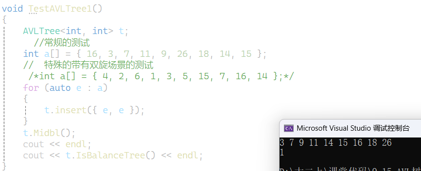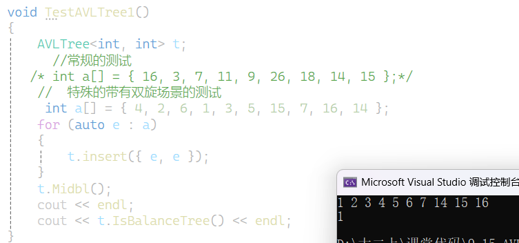 如下 可以看到对于两组测试用例 中序遍历的结果和判断每一个节点的高度和平衡因子的结果都是正确的