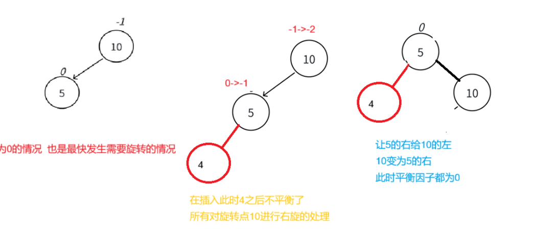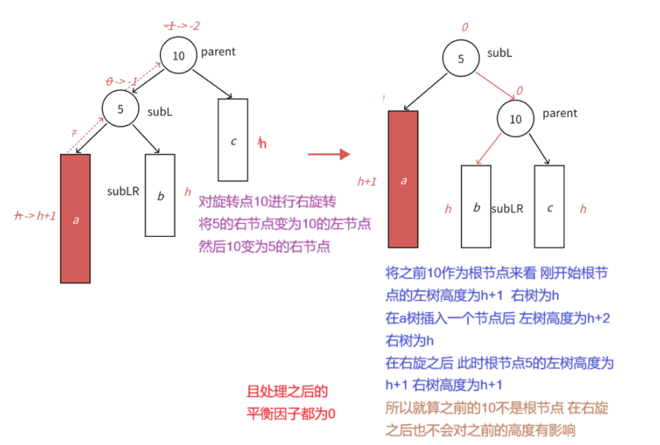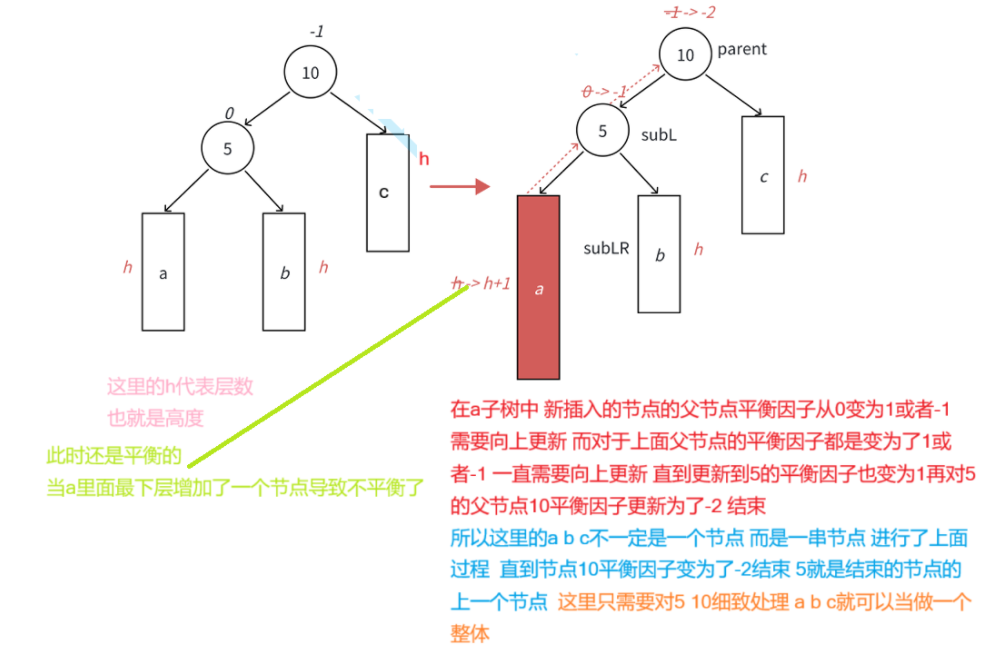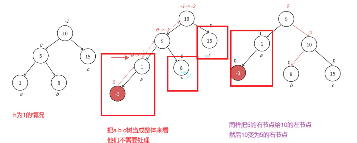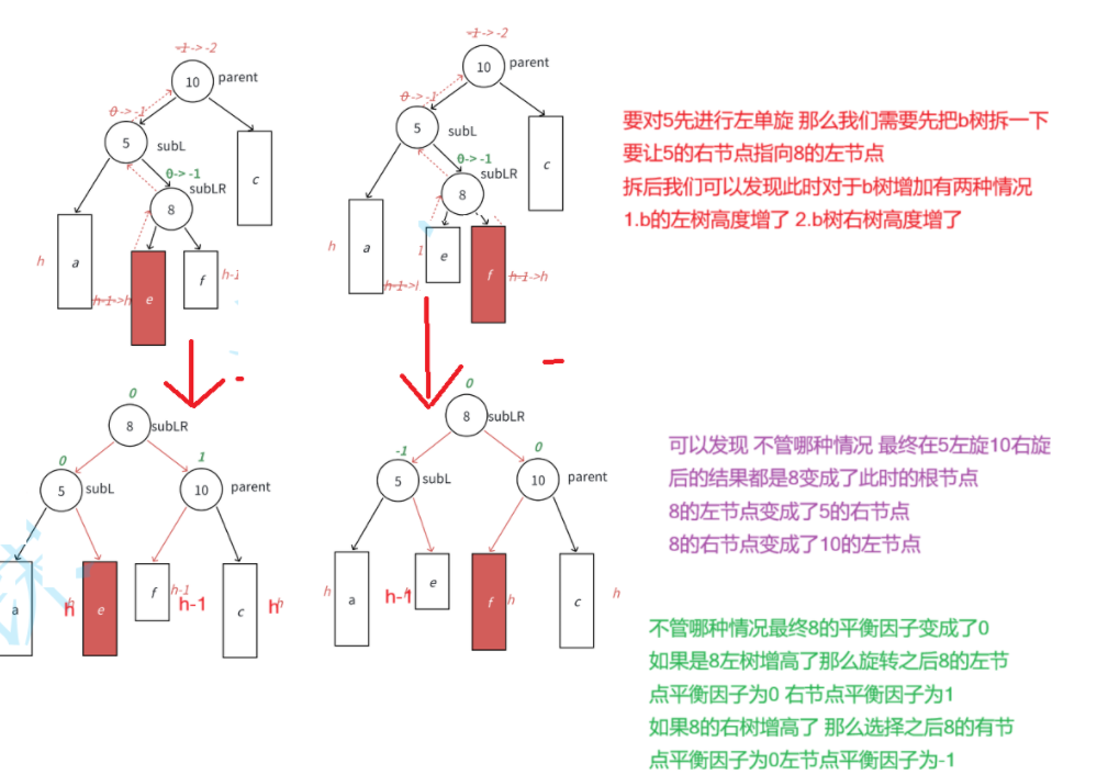 对于5的平衡因子必须是0->-1才是它的左树a树中变化引起的 才是这里右单旋的情况 对于它右树b树改变了5平衡因子0->1是之后左右双旋的情况