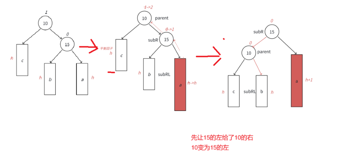 如下图 a树里面底层某一个新节点的增加对于它的父节点发生①情况 需要向上传递 然后上面的节点也一直是①的情况(如果发生②就结束了 如果是③在那里就要旋转处理了) 直到了找到第一个平衡因子变为2或者-2的节点 (也就是这里的10)该节点就是为旋转点 然后记录一下它的左节点5 (因为之后要对旋转点的左节点处理)