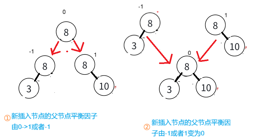 新插入节点的平衡因子一定是0 而对于它的父节点平衡因子的影响有两种情况