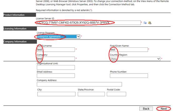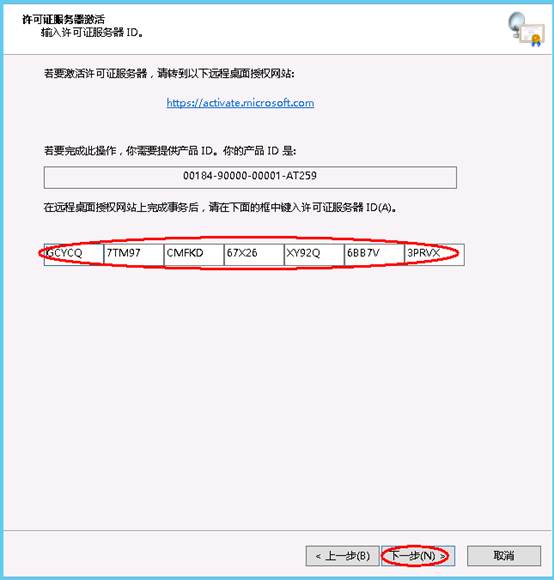 2.5 在下面界面中,输入“产品ID:00184-90000-00001-AT259”,按下图填写所需信息后,点击下一步。