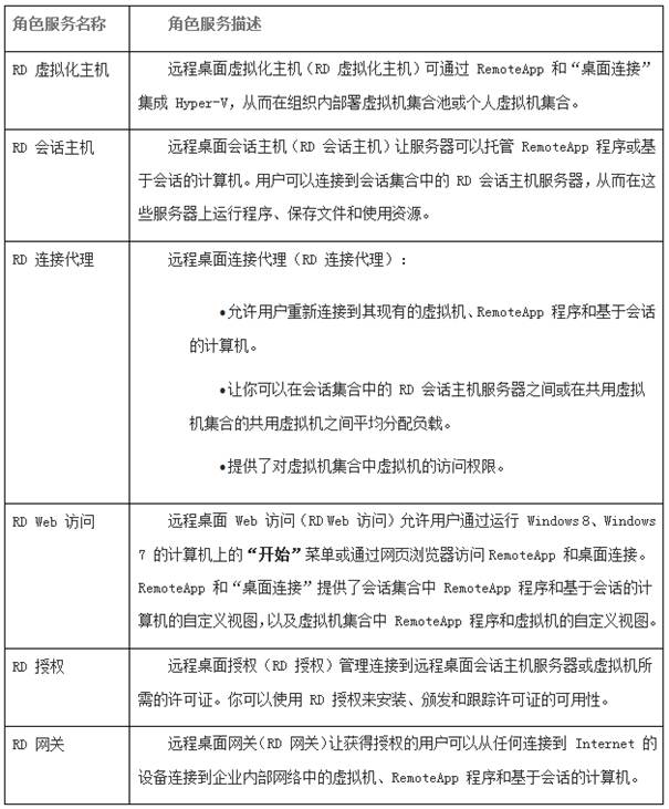 远程桌面服务是一项由若干角色服务组成的服务器角色。在 Windows Server 2012 中,远程桌面服务包含以下角色服务: