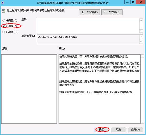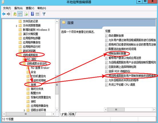 4.6 在远程桌面会话主机下, 找到 “连接”,按如下图所示设置“限制限制连接数量(可根据具体数量设置)”和“将远程桌面服务用户限制到单独的远程桌面”: