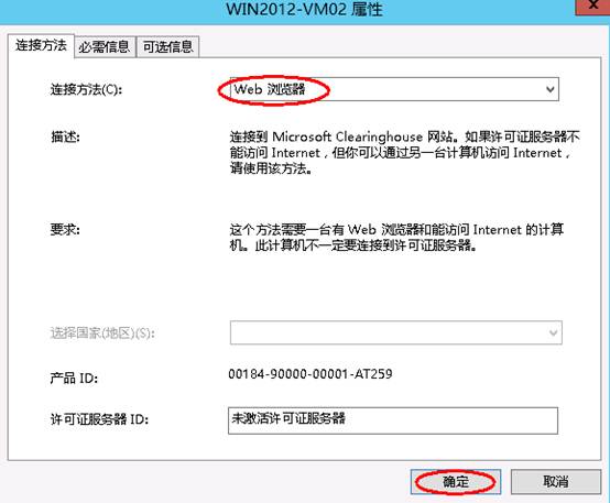 2.2 在属性对话框中,连接方法选择“Web浏览器”,记下对话框中出现的产品ID(00184-90000-00001-AT259),在获取服务器许可证时,需在网页上注册此ID。注意:如果终端服务器授权中没有服务器,请选择连接,然后输入本机服务器IP地址。