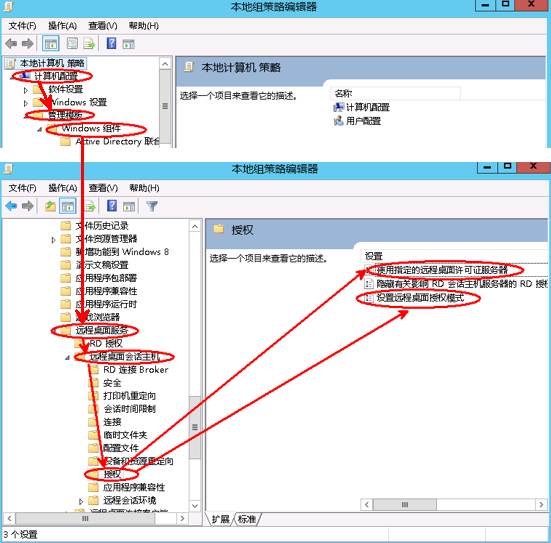 4.3 在计算机本地组策略里选择计算机配置-管理模板-windows组件-远程桌面服务-远程桌面会话主机-授权,找到 “使用指定的远程桌面许可服务器”和“设置远程桌面授权模式”。