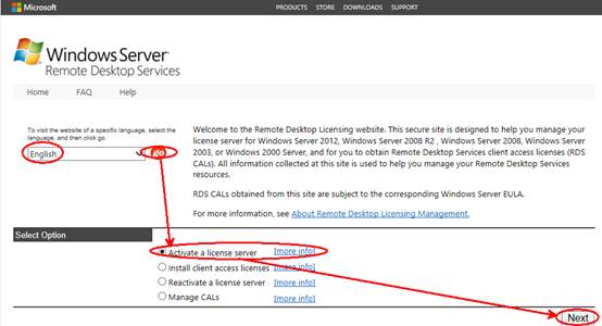 2.4 在Internet Explorer浏览器地址栏中输入https://activate.microsoft.com,点击GO ,开始注册并获取服务器许可密码向导。确保已选中“启用许可证服务器”项后单击"下一步"按钮。