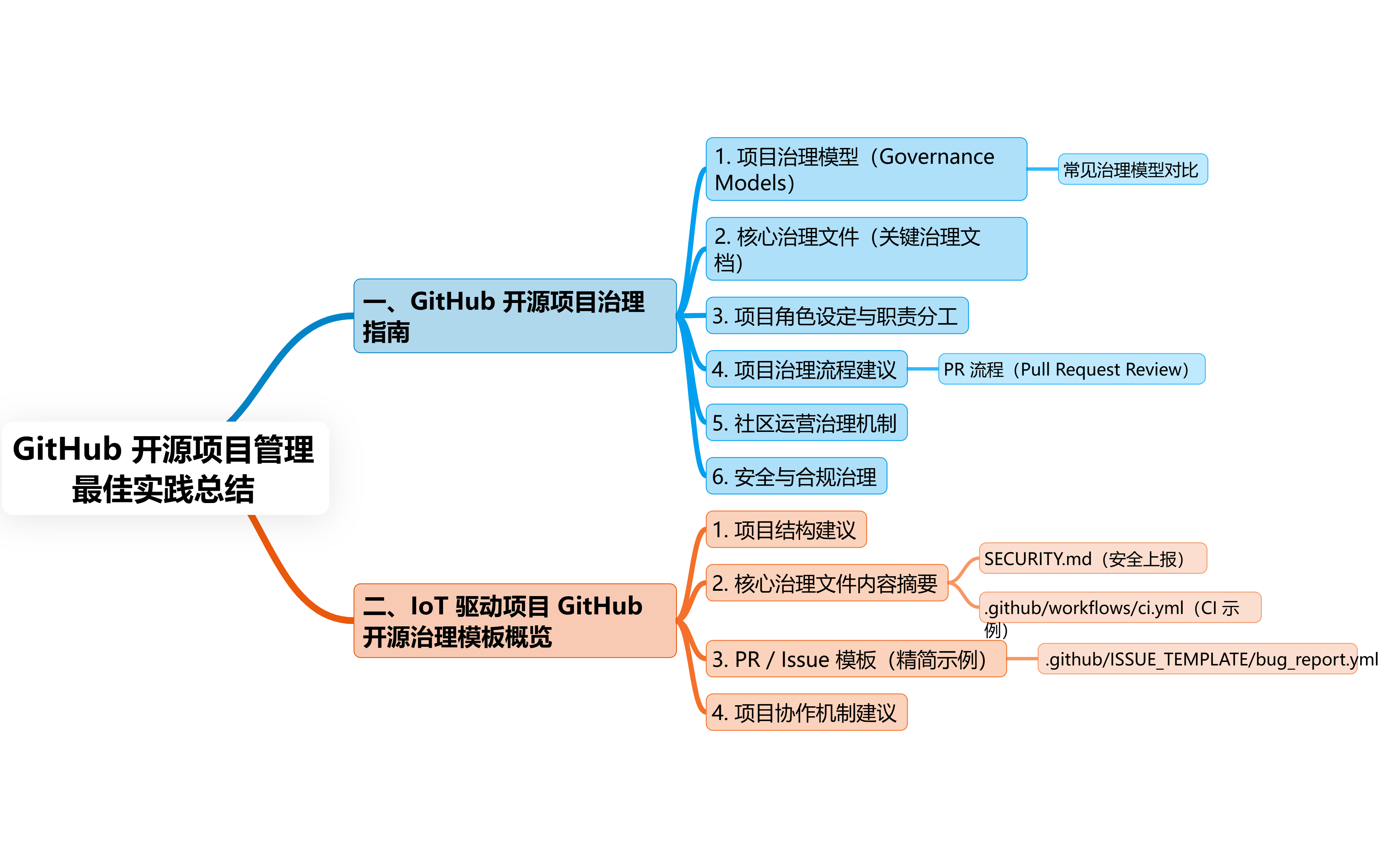 下面是一份完整的 GitHub 开源项目治理指南(含治理模型、关键文档模板、流程图建议等),适合用于: